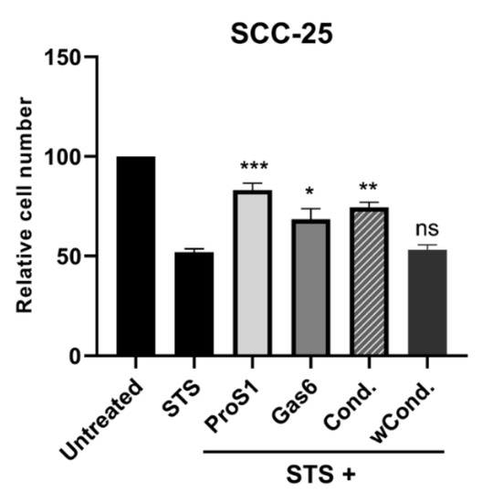 In addition, the natural ProS1 secreted by 786-0 cells was shown to be functional only due to its vitamin K-dependent carboxylation of the Gla domain. Conditioned medium from 786-0 (producer) cells cultured in the absence of warfarin stimulated cell survival when added to SCC-25 (responder) cells undergoing the staurosporine (0.1 µM) challenge to trigger apoptosis (Figure 7). However, conditioned medium from warfarin (1 µg/mL) pre-incubated 786-0 producer cells had no such protective effect. Therefore, these results together show that ProS1 is secreted as a functional, vitamin K-dependent ligand from human cancer cells and stimulates cancer cell survival via Tyro3 activation.