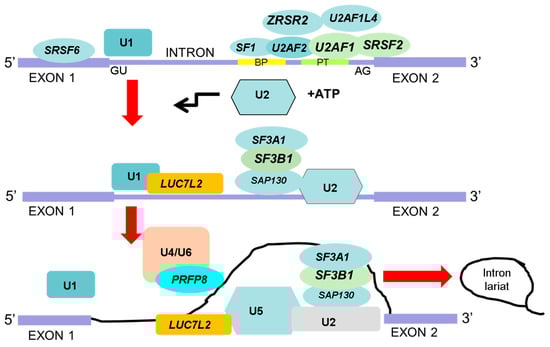 Myelodysplastic syndromes (MDS) are a genetically and clinically diverse group of clonal stem cell malignancies characterized by inefficient hematopoiesis, peripheral blood cytopenias, and an increased risk of transformation to acute myeloid leukemia (AML). Genetic alterations occurring at the level of a multipotent stem cell are believed to accelerate clonal evolution from MDS, sometimes resulting in transformation to acute leukemia, although no specific disease-initiating defect has been identified to date. In the last decade, several gene mutations acting as driver events have been identified with various frequencies across the spectrum of MDS and AML. Disease evolution is driven by positive selection of driver mutations. So far, more than 30 driver genes have been associated with the pathogenesis of leukemia [,]. Gene functional analysis has clustered these genes into pathways including DNA methylation, chromatin remodeling, RNA-splicing, cohesion complex, RAS family signaling, gene transcription, and DNA repair. One of the major classes of driver mutations is mutations in splicing factors (SF) (SF3B1, U2AF1, SRSF2, ZRSR2, PRPF8, LUC7L2) (Figure 1). SF genes encode for components of the spliceosomes. Spliceosomes are nuclear structures composed of five small nuclear RNAs (snRNA) and approximately 150 proteins, which catalyze the splicing reaction. The complex removes non-coding sequences (introns) from precursor messenger RNA and ligates coding sequences (exons) in order to form mature mRNA transcripts through early and late steps. Early steps involve recognition of the 5′ and 3′ exon/intron junctions and late steps recall all the spliceosome together. The information to define the splicing regions are included in short and conserved sequences at the 5′ splice site (SS), the 3′SS, and the branch site (BS). In higher eukaryotes, the BS is located approximately 18–40 nucleotides upstream of the 3′SS and is followed by a polypyrimidine tract. Many genes in humans are spliced into two or more transcripts with altered sequences through a process called alternative splicing. There are two types of pre-mRNA introns: U2-dependent (major spliceosome), which accounts for almost all the human introns, and U12-dependent (minor spliceosome), which accounts for less than a thousand introns [,].