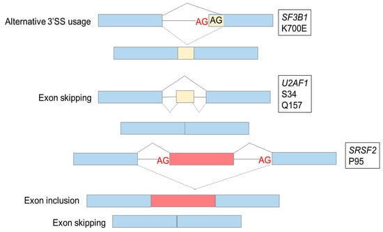 - Shiozawa, Y.; Malcovati, L.; Galli, A.; Sato-Otsubo, A.; Kataoka, K.; Sato, Y.; Watatani, Y.; Suzuki, H.; Yoshizato, T.; Yoshida, K.; et al. Aberrant splicing and defective mRNA production induced by somatic spliceosome mutations in myelodysplasia. Nat. Commun. 2018, 9, 3649. [Google Scholar] [CrossRef]