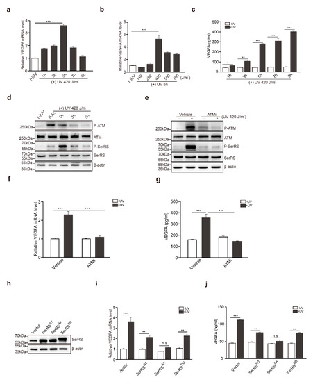 The ataxia telangiectasia mutated (ATM)–seryl-tRNA synthetase (SerRS)–vascular endothelial growth factor A (VEGFA) pathway played an essential role in UV-induced VEGFA expression in HaCaT cells. (a,b) mRNA levels of VEGFA were analyzed by RT-PCR. (c) VEGFA in supernatants was analyzed via sandwich ELISA. (d) Western blot analysis of P-ATM, ATM, P-SerRS, and SerRS expressions in HaCaT cells with or without UV treatment. (e) Western blot analysis of P-ATM, ATM, P-SerRS, and SerRS expressions in HaCaT Cells with or without treatments of UV and ATMi. (f) VEGFA mRNA levels were detected by RT-PCR. (g) VEGFA in supernatants was analyzed via sandwich ELISA. (h) Western blot analysis of SerRS expression; β-actin served as a loading control. (i) mRNA levels of VEGFA were analyzed by RT-PCR. (j) VEGFA in supernatants was analyzed via sandwich ELISA. All data above are presented as means ± SEM (n = 3, * p < 0.05, ** p < 0.01, *** p < 0.001) of three independent repeats.