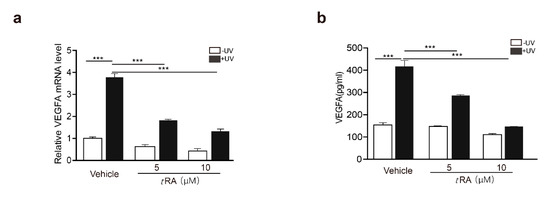 UV-induced imbalance between angiogenic and angiostatic factors is associated with many skin pathologies including aging and carcinogenesis [9,10,11,12]. tRA has been reported to be able to inhibit the expression of vascular endothelial growth factor (VEGF) and angiogenesis in various tumors and human skin [9,13,14]. VEGFA is the most extensively studied among all members of the VEGF family, which includes VEGFB, VEGFC, and placental growth factor (PIGF), for its key role in regulating angiogenesis [15,16,17]. Improper angiogenesis is an obvious characteristic in tumor development because tumors need an abundant nutrient supply in order to support the rapid proliferation of cancer cells [18,19]. Angiogenesis has been validated as an ideal target in tumor therapy for more than a decade, and inhibitors against the VEGF pathway are among the most promising anti-tumor reagents [20,21,22].