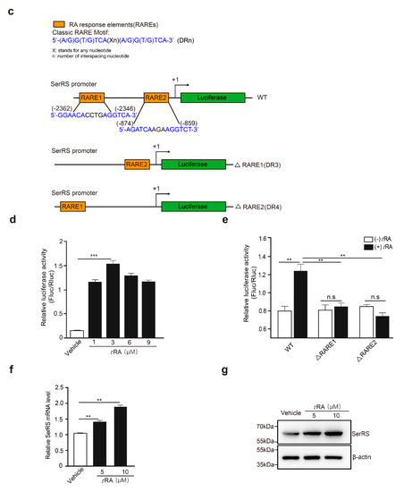 tRA has been reported to be able to inhibit UV-induced VEGFA expression and skin angiogenesis [9]. We first confirmed that, in HaCaT cells, tRA was able to reduce UV-induced VEGFA expression in a dose-dependent manner (Figure 2a,b). Similar effects were also achieved by the overexpression of SerRS (Figure 1i,j). To investigate if tRA inhibited VEGFA induction through regulating SerRS expression, we first searched the SerRS promoter for possible binding sites of the tRA receptor, namely, retinoic acid receptors (RARs) [8]. We found two candidate retinoic acid response elements (RAREs) at ‘(−2362) 5’-GGAACACCTGAGGTCA-3’ (−2346)’ (RARE1) and ‘(−874) 5’-AGATCAAGAAGGTCT-3’ (−859)’ (RARE2), which harbor the well-established RAR-binding motif ‘(A/G)G(T/G)TCA(Xn)(A/G)G(T/G)TCA’ [25] (Figure 2c). To test if the SerRS promoter was regulated by tRA, we ligated the SerRS promoter to the luciferase reporter gene (Figure 2c). As expected, tRA could enhance the expression of the reporter gene driven by the SerRS promoter (Figure 2d). Deletion of either RARE1 or RARE2 could completely abolish tRA-enhanced expression of the reporter gene (Figure 2e), confirming that these two sites on the SerRS promoter were true RAR-binding sites.
