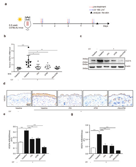ATM inhibitor enhanced the effect of tRA on the protection of mouse skin from UV-induced VEGFA expression. (a) Experimental model. (b) mRNA of VEGFA was quantified by RT-PCR. (c) Western blot was adopted to analyze VEGFA expression. (d) Representative images of VEGFA immunohistochemical staining in cutaneous tissues from C57BL/6 mice with indicated treatments. (e) Quantification of VEGFA immunohistochemical staining. (f) Immunofluorescence analysis for VEGFA in the skin of mice with indicated treatments. (g) Quantification of VEGFA immunofluorescence analysis. Three different fields per section were examined. Data are presented as means ± SEM for three subjects. (n = 8, * p < 0.05, ** p < 0.01, and *** p < 0.001 versus control group by the Wilcoxon signed-rank test).