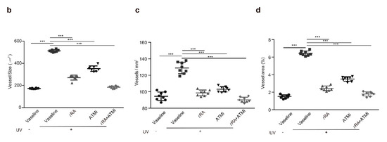 Because the skin is the largest organ of the human body and is almost completely exposed to the external environment, it is therefore more susceptible to external environmental influences and damage than other organs. Excessive UV radiation from sunlight is the most dangerous element for cutaneous photodamage, photoaging, and tumors [28,29,30]. The characteristic feature among various pathologic alterations caused by UV exposure is the activation of angiogenesis, which is supposed to be responsible for tumorigenesis and tumor growth.