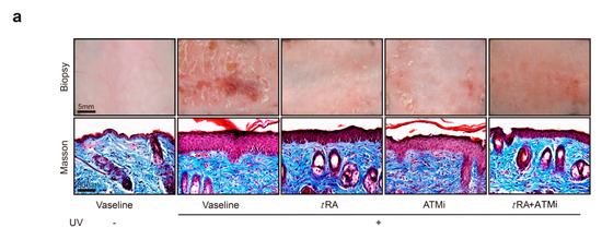 UV-induced photo damage results in various pathologic alterations on the skin, such as epidermal thickness, skin hydration, erythema, wrinkle formation, and collagen degradation. Photos of the bare skin were taken every day to record the changes, and Masson staining was adopted to demonstrate the thickness of the epidermis and the morphological characteristics of collagen (Figure 5a,b). The Local Skin Response Grading Scale (LSR) was also applied to quantify the photo damage on skin (Figure 5c and Appendix Table A1). Acute UV exposure led to obvious skin erythema, coarseness, thickening, edema, and the appearance of scales in mice by day 2 after UV irradiation. Treatments with tRA and ATMi together achieved the best skin protection against these pathological changes when compared to groups treated with Vaseline control, tRA alone, or ATMi alone (Figure 5a–c).
