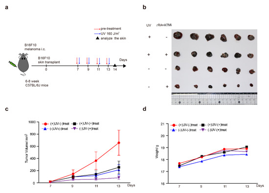 C57BL/6 mice were purchased from Vital River Laboratory Animal Technology Company (Beijing, China) and maintained in a specific pathogen-free facility. Animal use complied with Nankai University Animal Welfare Guidelines and were approved by the Nankai University Animal Care and Use Committee (Ethic approved number: 20180004). Hair on the dorsal side was shaved and removed, depilatory cream (VEET, RB Group of Companies, Berkshire, UK) was also used to clean the back thoroughly. For tumor transplantation, a total of 2 × 105 cells were injected intracutaneously into the right flanks. tRA was smeared on the shaved back, and KU-55933 was intraperitoneally injected one hour before UVB exposure. Vaseline (Unilever, London, UK) was smeared as a control. Mice were fixed to be completely bare on the back during irradiation. Eight mice were in each group, and a single dose of UVB was 160 J/m2 at a frequency of once every two days, with the total dose of 480 J/m2. Skin responses were recorded daily and quantified on the basis of the LSR Grading Scale every day, including erythema, scales, edema, and roughness.