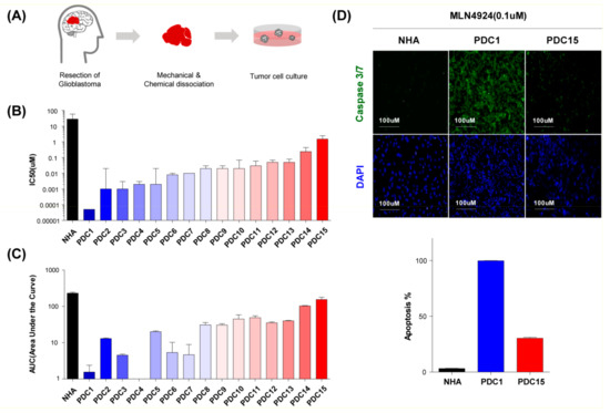 Therefore, in this study, we tested the efficacy of MLN4924 in glioblastoma cells. Experiments of efficacy in normal cells and four glioblastoma cell lines showed that MLN4924 reduced proliferation, and caused apoptosis in cancer cells specifically. Human cancer cell lines have been customarily used in preclinical cancer biology studies. However, the general process of establishing human cell lines causes irreversible loss of important biological properties. Cell lines are homogeneous and undifferentiated compared to actual cancer tissues through prolonged selection pressure under in vitro culture conditions [40].