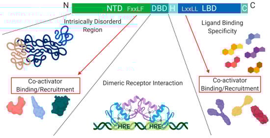 A structural feature of nuclear hormone receptors that has previously been overlooked is the activation function-1 (AF-1) protein domain within the N-terminal region and the activation function-2 (AF-2) in the LBD. This is a common feature found in Class I–III, but not in Class IV [8]. The presence of AF-1 in the intrinsically disordered region of the N-terminal allows for flexibility and becomes ordered when bound to individual partners [8]. On the C-terminal end, AF-2 requires ligand-binding to become active but remains ordered in all states [8]. Unfortunately, when AF-2 is spliced out, the protein can undergo a gain of function mutations that no longer require ligand-binding for activation and cause dysregulated protein expression [8]. On the outside of the AF-2 protein domain, at α-helix 12, there is a hot spot for steroid co-activator binding (SRC) mediated through its LxxLL motif, which promotes transcriptional activity (Figure 2) [9]. Similarly, within the NTD, there is a five amino acid long motif FxxLF that binds and stabilizes the N-terminal and C-terminal domains. This binding promotes the stabilization of dimers through an active conformational state, preventing ligand-bound dissociation [5,9,10].