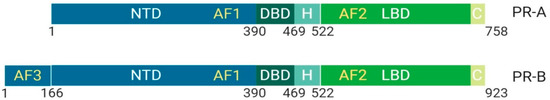 PR-B has an extended NTD, which is called a unique domain or activating function domain 3 (AF-3) [10]. PR-B is more transcriptionally active than PR-A and plays a crucial role in mammary development. However, dominant expression of PR-A is implicated in cancer onset due to non-genomic activities mediated through the binding of activated Src kinases [10].