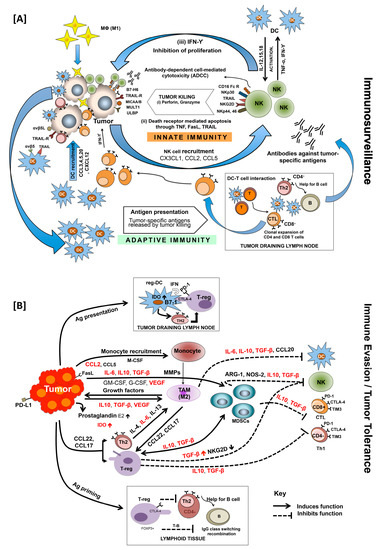 Natural killer (NK) cells are among the first innate immune cells that respond to inflammation and cancer. Activated NK cells eliminate target cancer cells by either secreting perforin or granzyme or by apoptosis mediated through interaction of TNF, FasL, and TRAIL with corresponding death receptors (Figure 1A) [36]. Activation of NK cell depends on the balance of their activating (NKG2D) and inhibitory receptor (KIR). Cytokines, such as IL-2, IL-12, IL-15, IFN-α, and IFN-β, are required for NK cell activation [36,37]. Tumor cell killing by NK cells offers a TSA-enriched environment for dendritic cells (DCs), another subset of innate immunity that plays an important role in tumor cell clearance, either directly or through activation of adaptive immune responses. Several complementary mechanisms help DCs to capture NK cell-induced TSAs, which are then processed and bound to MHC-I/II molecules during their journey to draining lymph nodes (DLNs) [38]. Besides, TSAs can also directly reach lymph node-resident DCs through lymph [39]. These antigen-loaded lymph node-resident DCs are the first to present antigenic peptides to naïve CD4+ T-cells leading to T-cell priming and IL-2 production, facilitating their proliferation and expansion. Subsequently, activated DCs from peripheral tissues migrate to lymph nodes and interact with these activated CD4+ T-cells, facilitating their conversion to effector T-cells (Figure 1A). It is important to mention here that immature, non-activated DCs that present self-antigens to T-cells bring about immune tolerance by T-cell deletion or by suppressor T-cell differentiation [40]. Upon interaction with mature DCs, naïve CD4+ T-cells differentiate into effector T-cells that include T-helper (Th1, Th2, Th17 or T-follicular helper (Tfh)) cells. These cells help in differentiation of B-cells into antibody-secreting cells as well as in generation of regulatory T (Treg) cells. Naïve CD8+ T-cells, on the other hand, differentiate into effector cytotoxic T-lymphocytes (CTLs). Tissue-localized DCs can also be polarized into distinct effector phenotypes by interaction with other cells of innate immunity via the release of IFNs, TNFs, and other cytokines [41,42,43,44,45,46,47]. Much like DCs, macrophages are phagocytic cells that reside in many tissues, recognize TSAs, and produce high levels of cytokines including chemokines that function as the alert signals for the immune system [48]. Activation of innate immunity promotes various inflammatory reactions and triggers the release of inflammatory cytokines as well as other inflammatory mediators [48,49]. In context to cancer, there are reports suggesting anti- as well as pro-oncogenic roles of innate immunity. Contrary to the physiological role, a plethora of evidence suggests the role of the immune system in the establishment of tumor cells and their subsequent progression. This, however, is due to the manipulation of the immune system by transformed cells, their escape from immune surveillance, and which eventually makes the disease clinically significant [50]. All this raises questions regarding the effectiveness of immunity against spontaneously arising tumors, spiking interest in immunotherapy for cancer [51].