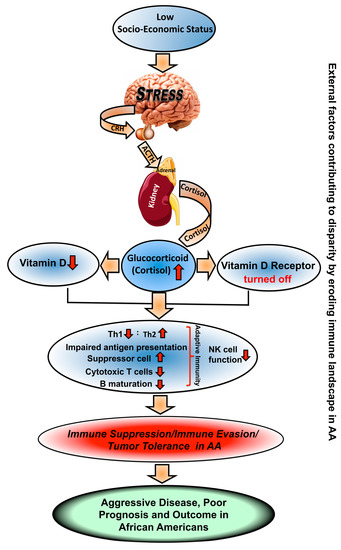 In addition to testosterone, glucocorticoid also modulates immune function. It can act as an immune stimulant however, when it is consistently high, as found with low SES [113], it becomes immune suppressive. Those AAs belonging to lower SES will have increased cortisol and hence will be more prone to tumor-induced immune suppression. Glucocorticoid levels regulate transcription of various genes, such as histone acetylation in the promoter region of perforin and granzyme B, thereby affecting NK cell cytotoxicity [114] as well as CTLs. Thus, changes in this hormone will have a global effect on host immunity [115]. It is also known that high glucocorticoid levels lead to the resistance of immune cells to immune stimulants that further deteriorate defense against cancer. Considering the structural similarity and, hence, the shared target genes between glucocorticoid and androgen receptors, it would not be surprising if glucocorticoid underlies castration resistance in PCa [116] and its associated disparities.