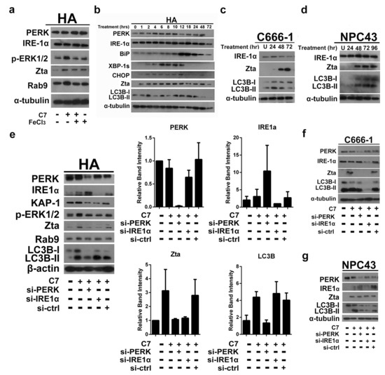 ER stress is required for autophagy initiation and EBV lytic reactivation. (a) HA cells were either untreated or treated with either 20 μM C7, 20 μM C7 precomplexed with iron or 20 μM FeCl3 alone for 2 h. The expression of PERK, IRE-1α, phosphorylated ERK1/2, Zta and Rab9 was detected by western blot analysis. Cellular α-tubulin was assessed as a loading control. (b) HA cells were treated with 20 μM C7 for 0, 1, 2, 4, 6, 8, 10, 12, 18, 24, 48 and 72 h. The expression of PERK, IRE-1α, BiP, XBP-1s, CHOP, Zta and LC3B was detected by western blot analysis. Cellular α-tubulin was used as a loading control. (c) C666-1 (d) NPC43 cells were either untreated or treated with 40 μM C7 for 24, 48 and 72 h. The expression of IRE-1α, Zta and lipidated or free LC3B (LC3B-II or LC3B-I, respectively) was detected by western blot analysis. Cellular α-tubulin was assessed as a loading control. (e) siRNA knockdown on PERK and IRE-1α was performed in HA cells. Scramble siRNA was performed as a control. The cells were treated with 20 C7 μM for 2 h. The expression of PERK, IRE-1α, KAP-1, phosphorylated ERK1/2, Zta, Rab9 and LC3B was detected by western blot analysis. Cellular β-actin was assessed as a loading control. Experiments were repeated and bands representing PERK, IRE-1α, Zta and LC3B were quantified and plotted as relative band intensity by ImageJ software and processed by GraphPad Prism 6 software. Statistics were calculated with Student’s T test. (f,g) siRNA knockdown on PERK and IRE-1α was performed in C666-1 and NPC 43 cells, respectively. Scramble siRNA was performed as a control. The cells were treated with 40 μM C7 for 72 h. The expression of PERK, IRE-1α, Zta, and LC3B was detected by western blot analysis. Cellular α-tubulin was assessed as a loading control.