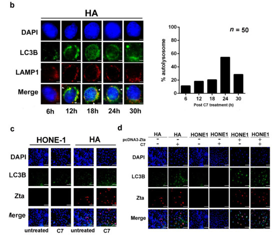 Since EBV and its viral proteins can manipulate various host cell mechanisms in B cells [15,16,17,18,19,20,21], we wonder about the mechanism of interaction between EBV proteins and autophagy in the epithelial cells. First, we compared autophagy progression by monitoring autolysosome formation in HA and HONE-1 cells (EBV-negative counterpart of HA). Given that autolysosomes are established by fusing autophagosomes with lysosomes [13], lysosomal marker, LAMP1, and autophagosome marker, LC3B, were stained with red and green fluorescent protein-tagged antibodies, respectively. Autolysosomes would appear as yellow puncta in fluorescent microscopy. From our results, within the first 30 h post-C7 treatment, autolysosomes can be observed in HA cells (Figure 3b, denoted with white triangles, n = 50 per time point). It spiked at 24 h post-C7 treatment in which autolysosomes can be observed in around 60% of the cells that underwent autophagy (Figure 3b and Figure S2b). However, this could not be observed in HONE-1 cells. Autolysosome formation within the first 30 h post-C7 treatment is low i.e., around 1% on average (Figure 3a, n = 50 per time point), and it could only be first observed at 48 h post-C7 treatment (Figure S2a, denoted with white triangles). The above result suggested that EBV could accelerate the progression of autophagy.