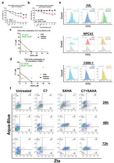 Combinatorial treatment with C7 and HDAC inhibitors result in synergistic killing of NPC cells. (a) HA and HONE-1 cells were treated with 0, 0.625, 1.25, 2.5, 5, 10, 20, or 40 μM C7 for 48 h followed by testing using MTT assay. Cell viability was plotted. (b) HA and HONE-1 cells were treated with 0, 0.312, 0.625, 1.25, 2.5, 5, 10, 20 μM SAHA for 48 h followed by testing with MTT assay. Cell viability was plotted. (c) HA and (d) C666-1 cells were treated with a gradient combination of C7 and SAHA for 48 h. Synergisms of proliferation inhibition of the two drugs in these cells were analyzed by isobologram analysis. (e) HA, NPC43 and C666-1 cells were either untreated or treated with 20 μM (40 μM for NPC43 and C666-1 cells) C7, 10 μM (20 μM for NPC43 and C666-1 cells) SAHA or the combination of the two compounds. DNA fragmentation was analyzed with TUNEL assay. Signals were detected by flow cytometry and data were processed with FlowJo software. (f) HA cells were either untreated or treated with 20 μM, 10 μM SAHA or the combination of the two compounds for 12, 24, 48, or 72 h. Percentage of cell death and the expression of CC3 and Zta was analyzed by flow cytometry as stated and data were analyzed with FlowJo software.