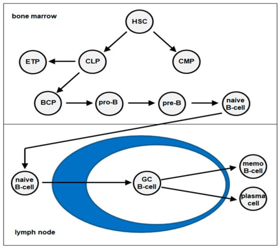 The process of hematopoiesis is responsible for the production of all types of blood cells. Hematopoietic stem and progenitor cells (HSCs) generate common myeloid and lymphoid progenitors (CMP and CLP) which, respectively, represent the starting points for the myeloid and lymphoid cell lineages. The latter produces all types of lymphocytes comprising B-cells, T-cells, natural killer (NK)-cells and innate lymphoid cells. Early B-cell development, which includes the rearrangements of the B-cell receptor genes (immunoglobulin heavy chain, IGH), takes place in the bone marrow and begins with the CLP-derived B-cell progenitor (BCP). BCPs differentiate via the pro-B-cell and pre-B-cell stages into naïve B-cells. In contrast, early T-cell progenitors (ETP) migrate into the thymus to complete their differentiation. For the final differentiation steps to memory B-cells (memo B-cell) and plasma cells via the stage of germinal center (GC) B-cells, naïve B-cells migrate from the bone marrow into lymph nodes, the spleen and other lymphoid tissues [,,] (Figure 1). In these compartments, additional molecular alterations occur, like somatic hypermutation and class switching of the IGH genes. These alterations are performed at the DNA level and the process of class switching is additionally connected with gene rearrangements.