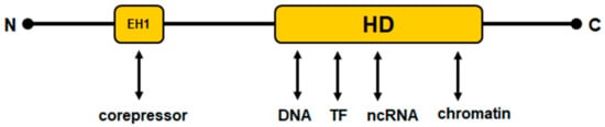 Homeobox genes encode TFs, which regulate fundamental processes in development and differentiation in both embryogenesis and the adult. They share the conserved 180 bp long homeobox, which encodes the homeodomain at the protein level. This domain consists of 60 amino acid residues and mediates specific interactions with DNA, chromatin, non-coding (nc)RNA and cooperating TFs, thus representing a common platform of their gene regulatory activities [].