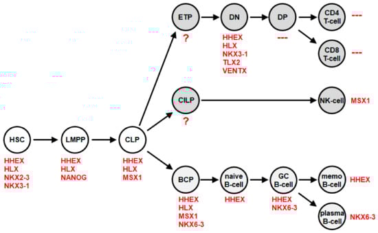- Jackson, J.T.; Nasa, C.; Shi, W.; Huntington, N.D.; Bogue, C.W.; Alexander, W.S.; McCormack, M.P. A crucial role for the homeodomain transcription factor Hhex in lymphopoiesis. Blood 2015, 125, 803–814. [Google Scholar] [CrossRef]