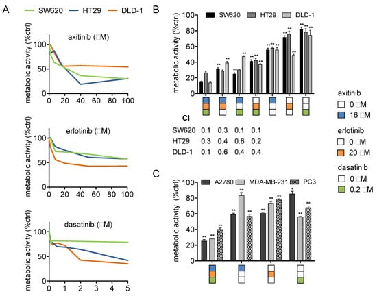Synergistic drug combination (SDC) of axitinib, erlotinib, and dasatinib synergistically inhibits cancer cell metabolic activity. (A) Dose response curves of axitinib, erlotinib, and dasatinib in the CRC (SW620, HT29, DLD-1) cell lines. (B) Metabolic activity of the SDC compared to the two-drug combinations. CI indicates the Combination Index that was assessed using the Chou–Talalay method [27]. CI values are showed below the graph. CI < 0.9 indicates synergism, CI = 0.9 indicates an additive effect, and CI > 1 indicates antagonism. Significance (* p < 0.05, ** p < 0.01) for two-drug combinations and monotherapies is indicated as compared to the SDC. (C) Metabolic activity of the SDC in ovarian carcinoma (A2780), breast cancer (MDA-MB-231), and prostate cancer (PC3) cells. Significance (* p < 0.05, ** p < 0.01) is indicated as compared to control. (A,B) Color coded drug doses include axitinib 16 μM, erlotinib 20 μM, and dasatinib 0.2 μM and are based on our previous study [20]. Metabolic activity was assessed after 72 h of drug administration by the CellTiter-Glo® luminescence assay and are represented as a percentage of the control. Cells treated with 0.1% DMSO were used as a control (ctrl). Error bars indicate SEM.