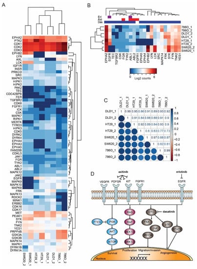 Phosphokinase comparison of colorectal cancer (CRC) cell lines SW620, HT29, and DLD-1 with the renal cell carcinoma (RCC) cell line 786-O. (A) Phosphoproteomics analysis of the untreated cell lines was performed on pTyr immunoprecipitated tryptic protein digest. All detected phosphorylated protein kinases over a threshold of five summed normalized spectral counts were included. The heatmap shows log2 expression of counts and indicates comparable expression profiles among the CRC line and the RCC reference line 786-O. (B) Phosphorylated protein kinase drug targets of the combination that was used was similar as in (A). Note the absence of EGFR (erlotinib target) in SW620 and the absence of FGFR1 (axitinib target) in HT29. (C) Correlations of phosphorylated protein kinase expression in the 4 cell lines. (D) Schematic overview of drug targets and their downstream signaling pathways.