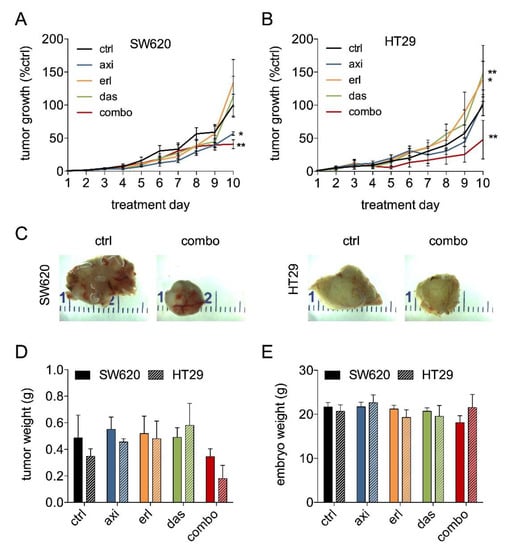The presence of KRAS and BRAF mutations in these cell lines might contribute to insensitivity to erlotinib as studies showed that patients with BRAF mutations do not benefit from anti-EGFR treatment [34]. Furthermore, in SW620, administration of axitinib led to a significant tumor growth inhibition, which might be attributed to its relatively high expression of axitinib targets FGFR1 and TNIK (Figure 3B). Axitinib also targets additional angiogenic growth factor receptors (e.g., VEGFRs, PDGFRs, TIEs) that are present on tumor endothelial cells rather than on tumor cells. Ontology and pathway enrichment analysis for genes differentially expressed in HT29 and SW620 revealed that the process of angiogenesis is enriched in SW620 but not in HT29 (Supplementary Figure S3). As such, the axitinib treatment might have well-acted on both the tumor and the stromal cells in SW620. In all CAM tumor experiments, embryo weight was measured on the day of experiment termination (Figure 5E) and mortality rates were not affected by any of the treatments.