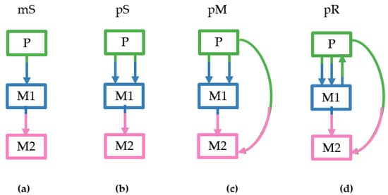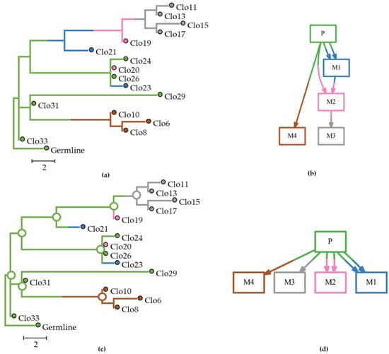 Examples of the four clone seeding scenarios as simulated by El-Kebir et al. [], showing the direction of clone seeding events that were allowed to occur among tumor sites: (a) monoclonal single-source seeding (mS); (b) polyclonal single-source seeding (pS); (c) polyclonal multisource seeding (pM); (d) polyclonal reseeding (pR).