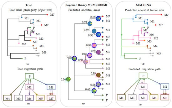 Figure 4 shows a set of multiple and reseeding clone migrations, as seen in panel a, between primary and seven metastases, and the associated clone phylogeny, as seen in panel b. In panel c, we observe the predicted tumor sites at an internal node along with their posterior probabilities produced by BBM using the clone phylogeny in panel a. Corresponding results from MACHINA are shown in panel d. Both PMH-con and PMH-TR approaches produced the same result for this dataset. The predicted ancestral tumor sites (source-tumor sites at ancestral nodes) and migration paths were congruent with the expected (true) migration paths for this example dataset and all methods, as seen in panel e.