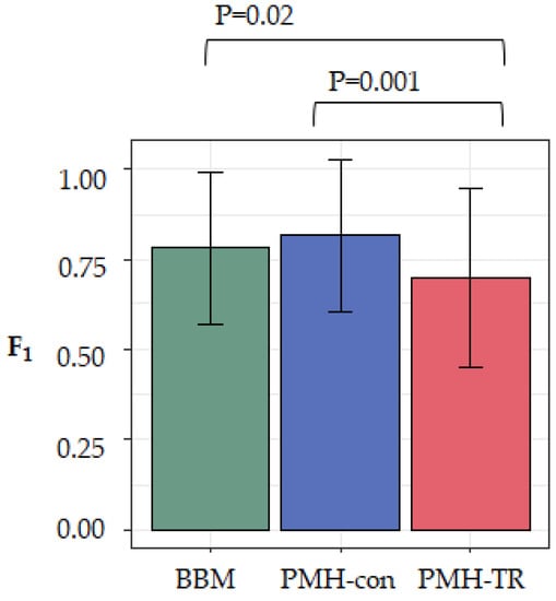 Overall performance based on F1-scores of the three evaluated approaches (BBM, PMH-con, and PMH-TR) on simulated datasets.