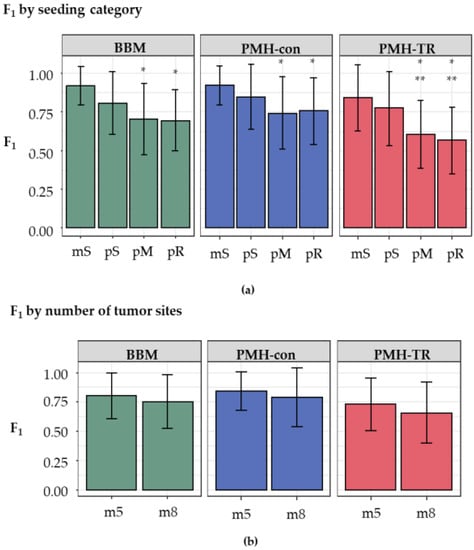 We also examined the impact of the number of tumor sites within a dataset. Datasets were grouped into two categories, those with a small number of tumors (5–7 tumors per dataset, m5 datasets) and those with a larger number of tumors (8–11 tumors per dataset, m8 datasets). Although the average F1-scores of m5 datasets were slightly higher than those of the m8 for all methods (0.82 and 0.76 for BBM; 0.85 and 0.79 for PMH-con; and 0.74 and 0.67 for PMH-TR, respectively), as seen in Figure 6b, these differences were not statistically significant in the t-tests.
