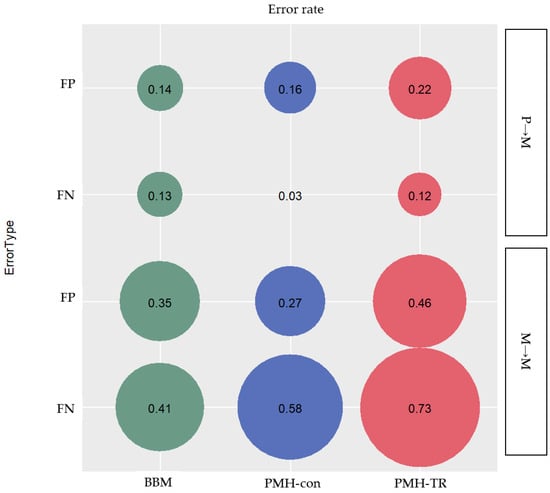 We found that PMH-con outperformed the other methods in identifying correct P→M paths. The average error rate of FNs of P→M paths was only 3%, while the errors inferred by BBM and PMH-TR were 13% and 12%, respectively, as seen in Figure 7. However, PMH-con produced more incorrect P→M paths than BBM with error rates of 16% and 14% for PMH-con and BBM, respectively. PMH-TR produced a much larger number of incorrect P→M paths than the other methods, with an error rate of incorrect paths equal to 22%. That being said the PMH-con method might have recovered more correct P→M paths than BBM, but these include incorrect P→M paths.