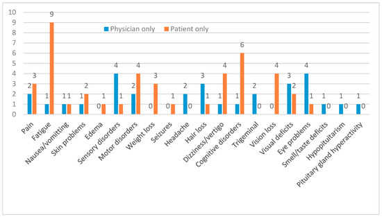 Differences in physician-reported outcome and patient-reported outcome (PRO). Symptoms are listed that were reported by either physicians only during follow-up, or patients only during PRO assessment.