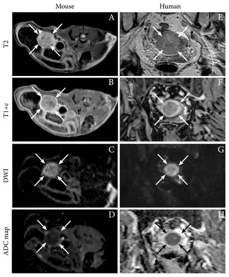 Axial magnetic resonance (MR) images depicting tumor (arrows) in an orthotopic endometrial cancer (EC) mouse model (Ishikawa cells) (A–D), and corresponding axial MRI images visualizing a uterine tumor (arrows) in an 87-year-old woman with EC (grade 2 endometroid, FIGO stage IIIC1; same patient as in Figure 2) (E–H). (A,E) T2-weighted images depict hyperintense tumors and (B,F) T1-weighted contrast-enhanced images (T1+c) depict moderately enhancing uterine tumors. (C,G) Both the preclinical- and human tumors exhibit restricted diffusion with hyperintensity on high b-value diffusion-weighted imaging (DWI) and (D,H) corresponding hypointensity on the apparent diffusion coefficient (ADC) maps. Images A–D are reproduced under the open access CC BY license from a previous publication [12].