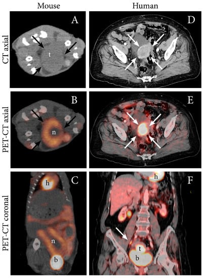 FDG PET-CT depicting an FDG-avid tumor in an orthotopic patient-derived xenograft (PDX) model of EC (grade 3 endometrioid) (A–C), and in an 87-year-old woman with EC (grade 2 endometroid, FIGO stage IIIC1; same patient as in Figure 1) (D–F). (A) In the mouse model, axial non-contrast CT imaging depicts a large tumor (t) (arrows) in the abdomen whereas (B) axial (C) and coronal FDG PET-CT display increased FDG uptake in the periphery of the tumor (arrows) and a central necrotic core (n). (D) In the patient, diagnostic contrast-enhanced axial CT image depicts a slightly enhancing primary tumor (arrows) and (E) axial and (F) coronal FDG PET-CT depict an FDG-avid primary uterine tumor (arrow) and a metastatic parailiac lymph node (arrow). Physiologic FDG uptake in the heart (h), liver, kidneys, renal pelvis and intestines and urinary FDG excretion to the bladder (b) is visible.