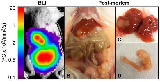 Bioluminescence imaging of an orthotopic EC mouse model. (A) Bioluminescence image and (B) post-mortem examination of a female NSG mouse ten weeks post orthotopic implantation with luciferase-expressing Hec1B cells. (D) Post-mortem examination revealed a primary uterine tumor and (C) liver metastases corresponding to the bioluminescence signal.