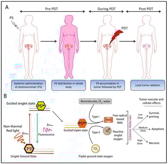 Photobiological and photochemical overview of photodynamic therapy (PDT). (A) Process of clinical PDT; the photosensitizer (PS) is administered systemically, followed by an appropriate PS-light interval, where the administered PS preferentially accumulates at the tumor site. Near-infrared (NIR) irradiation of the target tissue leads to localized tumor destruction. (B) Schematic representation of the Jablonski diagram showing the ground state of the PS (PS1) and the subsequent shift to a high energy excited state (PS1*) upon NIR irradiation. The PS in the excited state (PS1*) can either emit energy in the form of fluorescence radiation and relax to the ground state or undergo intersystem crossing to generate a long-lived excited triplet state (PS3*). Energy and electron transfer from the excited triplet state (PS3*) to biomolecules, water, triplet ground state oxygen, etc. leads to the formation of cytotoxic reactive molecular species (RMS). Depending on the dose of the RMS, the target tissues may either survive or undergo apoptosis/necrosis. Adapted from Nath et al. (2019) [26].