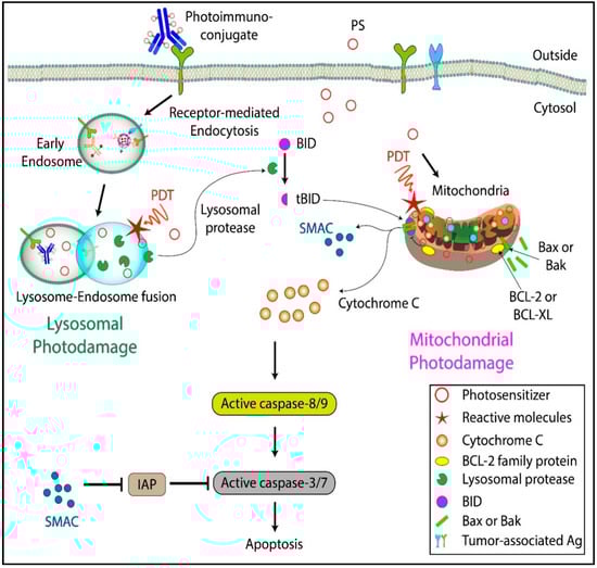 Mechanisms of cell death induced by free PS and photoimmunoconjugates (PICs). PICs bind to the corresponding receptor on the cell surface and are internalized through a receptor-mediated endocytosis pathway. The endocytosed PICs are sorted to the lysosome where they are cleaved, and the PS is released. Certain PSs diffuse through the cell membrane and localize to subcellular organelles, such as mitochondria. Depending on the PS formulation, the cells may undergo either lysosomal photodamage or mitochondrial photodamage leading to apoptosis/necrosis. Adapted from Nath et al. (2019) [26].