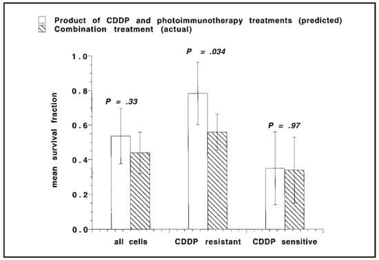 Comparison of predicted and actual mean survival fractions from cells treated with a combination of PIT and cisplatin (CDDP). CDDP-resistant cells were more responsive to combination treatment as compared to CDDP-sensitive cells. Adapted from Duska et al., 1999 [15].