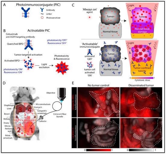 A limitation of intraperitoneal PDT in OvCa is the lack of compounds that are both good PSs and good tumor localizers. Although initial preclinical and clinical studies with free PSs demonstrated promising results, their use was limited due to the dose-limiting damage to internal organs [9,11]. PIT has been explored to circumvent this problem by combining the tumor-localization properties of monoclonal antibodies (MAB) with phototoxic properties of PSs. PIT involves the covalent linkage of a PS to an antibody, creating a PIC. An incubation period following PIC administration allows the antibody to potentially block the targeted receptor activation, followed by uptake and processing of the PIC by the target tissue. By combining the individual modalities, the efficacy of each is improved. Erbitux, for example, recognizes and blocks the epidermal growth factor receptor (EGFR) and is FDA approved for the treatment of metastatic colorectal cancer. EGFR is a rational target because it is overexpressed in 70–90% of advanced OvCa and is associated with aggressive and resistant tumors. Interestingly, some of the early work explored the inhibition of EGFR signaling in combination with benzoporphyrin derivative (BPD)-based PDT. A synergistic response between immunotherapy and PDT was observed with increased survival in vivo [83]. This was followed by conjugation of PSs to the EGFR antibody to achieve synchronized pharmacokinetics and enhance synergistic treatment outcomes. Growth factor receptor–targeted immunotherapy is suggested to be particularly promising because it exploits blocking the dependence of tumor cells on specific molecular pathways critical for survival and growth. This is made possible by synthesizing PICs in a way that the MAB remains functional in its ability to block receptor signaling. The persistent phototoxicity of PICs due to the “always-on” nature of the PS molecules can be minimized by using tumor-targeted activatable PIT (taPIT) where PS loading on the antibody can be optimized to attain a self-quenched “off state”, which can be activated to an “on state” following target site binding, internalization and lysosomal degradation of the PICs (Figure 4A–C). This approach of lysosome activated probes has been demonstrated in various studies to enhance specificity and selectivity in therapeutic and diagnostic applications (Figure 4D,E) [84,85,86]. While no therapy can be entirely selective, use of EGFR-targeted PIC in OvCa has some significant advantages—(i) EGFR is often overexpressed in OvCa leading to highly selective PS delivery in cancer cells compared to normal tissues, (ii) greater dependence of cancer cells on EGFR signaling, and (iii) confinement of light to the peritoneal cavity [87].