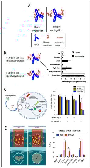 PIC design and effects. (A) Pictorial representation of direct vs indirect conjugation of the PSs to the antibody. The PS can be conjugated to the antibody either directly or through an intermediate polymer which increases the PS loading. (B) Effect of charge on cellular uptake and phototoxicity. PS conjugated to positively charged (poly-lysine conjugated) or negatively charged (succinylated poly-lysine conjugated) polymers were conjugated to the F(ab)2 fragment of OC125. The positively charged PIC led to an increase in both cellular uptake of PS and phototoxicity. Adapted from Hamblin et al. 1996 [17]. (C) Enhancing intracellular targeting by preventing lysosomal degradation. After co-incubation with PS (BPD) and fluorescein isothiocyanate-PIC (FITC-PIC), cells were sequentially irradiated with a low dose of 690 nm light to activate BPD-induced PCI and destabilize endosomal membranes, allowing PIC to be released into the cytosol. The second irradiation with 490 nm light initiates FITC-PIC mediated PIT to selectively kill Ki-67 expressing cells. Adapted from Wang et al. 2015 [123] and Wang et al. 2016 [108]. (D) Increase in BPD uptake in OvCar-5 cells due to the “carrier effect.” The binding and uptake of a single PIC results in the endocytosis of other nanoparticle-bound PICs. The “carrier effect” results in a significantly higher cellular uptake of PS and increases therapeutic outcomes in vivo. Adapted from Huang et al. 2018 [124].