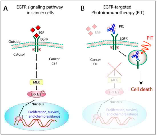 Multi-functional epidermal growth factor receptor (EGFR)-targeted PIT. (A) In cancer cells, overexpressed EGFRs bind to the corresponding ligands and promote cell growth, proliferation, metastasis, angiogenesis, etc. (B) The administration of PICs targeting EGFR leads to selective accumulation of the PS in the malignant tissue and inhibition of EGFR signaling pathway and induces localized cell death upon irradiation (right panel).