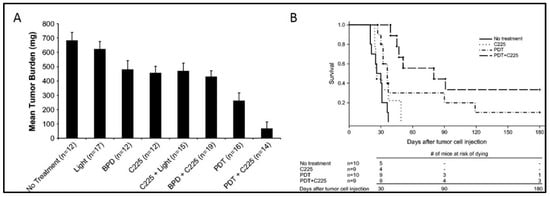 (A) Mean tumor burden for mice treated with either C225 or PDT monotherapy, compared with a combination therapy of C225 and PDT. (B) Kaplan–Meier survival curves for mice treated with photodynamic therapy only, C225 only, and mice treated with a combination therapy of PDT and C225. Combination treatment with PDT and C225 resulted in a significant enhancement in survival as compared to the individual monotherapies. BPD = benzoporphyrin derivative. PDT = photodynamic therapy. C225 (Cetuximab, Anti-EGFR antibody). Adapted from del Carmen et al. 2005 [83].