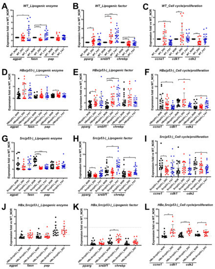 2.5. Expression of Lipogenesis Factor, Lipogenesis Enzymes, and Cell Cycle–Related Genes in HBx(p53-), Src(p53-), and HBx,Src(p53-) Transgenic Fish after Overfeeding