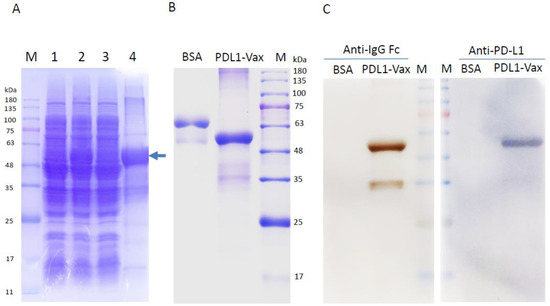 Expression and purification of the recombinant protein PDL1-Vax. (A) Protein fractions after lysis of bacterial cells (pET-PDL1-vax) were electrophoresed on 12% SDS–PAGE gels and then stained with Coomassie brilliant blue R250. Lane M, prestained protein molecular weight marker; lane 1, the cell pellets before IPTG induction; lanes 2, the cell pellets after isopropyl β-D-1-thiogalactopyranoside (IPTG) induction; lane 3, the soluble fraction after IPTG induction; and lanes 4, the insoluble protein fraction after IPTG induction. The recombinant protein PD-L1-Vax (arrow) is indicated. (B) Purified recombinant proteins PDL1-Vax were electrophoresed on 12% SDS–PAGE gels and then stained with Coomassie brilliant blue R250. (C) Western blot analysis of the purified recombinant protein PDL1-Vax using antibodies against human PD-L1 and IgG Fc. An irrelevant protein bovine serum albumin (BSA) was used as a negative control.