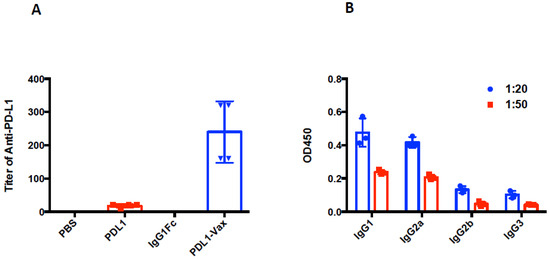 ELISA plates were coated with recombinant PD-L1 proteins (5 μg/mL) overnight at 4 °C. The PD-L1-coated plates were added with serial dilutions of sera and incubated for 1 h at room temperature. After extensive washes, the plates were added with biotinylated anti-mouse antibodies (anti-mouse IgG, IgG1, IgG2a, IgG2b, or IgG3) (Sigma-Aldrich, St. Louis, MO, USA) and incubated for 1 h at room temperature. Streptavidin-HRP was used to detect ELISA reactions. Optical densities (OD) were read at 450 nm on a BioAssay Reader (PerkinElmer, Wellesley, CA, USA). The titers are expressed as reciprocal endpoint dilutions that reach ≥2-fold OD450 values of control mouse sera.