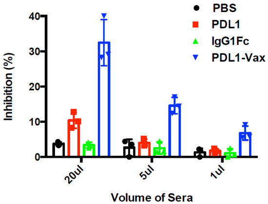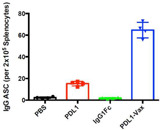 We investigated whether DCs loaded with PDL1-Vax can induce PD-L1-specific antibody responses. The results of our previous studies demonstrated that DC vaccination is able to induce antibody responses [3,4,5,39,40]. It is known that human IgG Fc functions in mice [41,42]. Mouse BM-derived DCs were loaded with recombinant PDL1-Vax proteins, the PDL1 protein, or IgG Fc fragment protein, respectively, and then matured with PolyI:C ex vivo. Poly I:C, a synthetic analogue of viral dsRNA, has long been known as a strong inducer of innate immune responses against infectious diseases and cancers by recognizing Toll-like receptors (TLR) 3 in the endosome [43]. It also stimulates immune responses by recognizing the cytoplasmic dsRNA sensors, Melanoma Differentiation-Associated protein 5 (MDA-5), and Retinoic acid-inducible gene I (RIG-I) [44,45,46]. Groups of mice were immunized with the DCs loaded with various antigens twice at a weekly interval. Figure 2A shows that PDL1-Vax-loaded DCs elicited PDL1-specific IgG responses, while DCs loaded with PDL1 protein only induced weak anti-PD-L1 responses. DCs, loaded with IgG1 Fc, did not induce anti-PD-L1 responses. We also performed assays for PDL1-specific antibody subclass profiling. Figure 2B shows that PDL1-Vax-loaded DCs induced a broad responses of IgG subclasses, including IgG1 and IgG2a. Similar results were obtained in repeated experiments. To test the ability of PDL1-Vax-loaded DCs to activate PD-L1-specific B cells, we used an anti-PD-L1 IgG-specific B cell ELISPOT assay to directly examine the frequencies of anti-PD-L1 IgG-producing B cells in the immunized mice. Figure 3 shows that frequencies of anti-PD-L1 IgG-producing B cells were significantly higher in PDL1-Vax-DC-immunized mice than in PDL1-DC-immunized mice and IgG Fc-DC-immunized mice. Moreover, the sera of the mice immunized with PDL1-Vax-loaded DCs inhibited the PD-1/PD-L1 interaction, as manifested by a competitive ELISA assay, while the sera of the mice immunized with PDL1-loaded DCs only weakly inhibited the PD-1/PD-L1 interaction and the sera of the mice immunized with IgG Fc-loaded DCs did not inhibit the PD-1/PD-L1 interaction (Figure 4). Taken together, these results demonstrate that vaccinations with DCs loaded with PDL1-Vax induce anti-PD-L1 antibody responses.