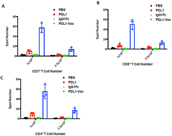 We investigated whether immunization with PDL1-Vax-DCs can induce PD-L1-specific T cell responses. Groups of mice were immunized with DCs loaded with PDL1-Vax, PDL1 or IgG Fc twice at a weekly interval. Two weeks later, CD3+ T cells were isolated from the splenocytes of immunized mice for ELISPOT assays [3,4,5,39]. Figure 5A shows that DCs loaded with PDL1-Vax induced stronger CD3+ T cell response than DCs loaded with PDL1 or IgG Fc. We further isolated the CD3+CD8+ CTL cells for ELISPOT assays. Consistent with the results of total CD3+ T cells, DCs loaded with PDL1-Vax were more potent than DCs loaded with PDL1-Vax in inducing PD-L1-specific CD8+ CTL responses (Figure 5B). We also determined whether immunization with transduced DCs can induce CD4+ Th responses. Figure 5C shows the ability of PDL1-Vax-DCs to induce CD4+ Th responses as well.