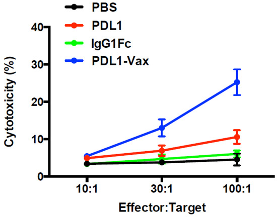 To determine whether immunization with PDL1-Vax DCs can indeed induce functional CTL responses, we performed the CTL assays [3,4,5,39]. Splenocytes from immunized mice in different groups were restimulated with the recombinant PD-L1 protein ex vivo and then cocultured with 51Cr-labeled syngeneic target PD-L1-expressing pancreatic cancer cells (Panc02-PD-L1) at various E:T ratios to measure the specific killing. Splenocytes from the mice immunized with PDL1-Vax-DCs killed target cells much more efficiently than those from mice immunized with PDL1-DCs or IgG Fc-DCs (Figure 6). Thus, these results demonstrate the ability of PDL1-Vax-DCs to induce PD-L1-specific CTL responses.