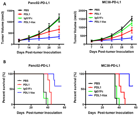 We further examined the ability of PDL1-Vax DC vaccination to inhibit PD-L1+ tumor growth in mice. Panc02-PD-L1 pancreatic tumor cells were inoculated subcutaneously in the flank of syngeneic C57BL/6 mice. Three days later, the mice were randomly assigned into different groups and then administered s.c. with DCs loaded with PDL1-Vax, PDL1, or IgG Fc twice at a weekly interval. Tumor growth of each group of mice was then monitored. As shown in Figure 7, PDL1-Vax-DC vaccinations significantly inhibited the growth of Panc02-PD-L1 tumor. PDL1-DC vaccinations only weakly inhibited the growth of Panc02-PD-L1 tumor and IgG Fc-DC vaccinations did not inhibit the growth of Panc02-PD-L1 tumor. Repeated experiments showed similar results. We also examined the ability of PDL1-Vax-DC vaccination to inhibit the growth of other types of PD-L1+ tumor cells. Consistently, PDL1-Vax-DC vaccinations also significantly inhibited the growth of murine colon adenocarcinoma cells MC38-PD-L1 (Figure 7). Taken together, these results demonstrate that PDL1-Vax-DC vaccinations are able to inhibit the growth of PD-L1 + tumor cells.