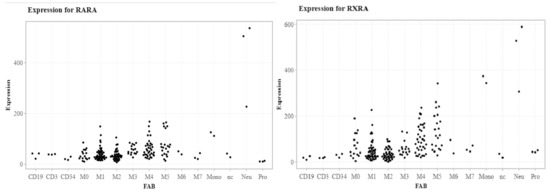 Expression profile of retinoic acid receptor alpha(RARA) and retinoic X receptor alpha (RXRA) in human samples. Expression profile of retinoid receptors in total bone marrow cells from 197 human AML cases and sorted normal bone marrow cells using RNA Seq. FAB is indicated on X-axis. (https://leylab.shinyapps.io/TCGA_AML_Web_App/).