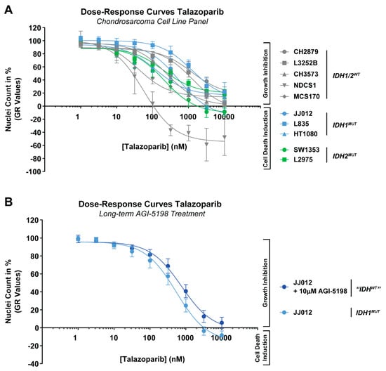 | Cell Line | Chondrosarcoma Subtype | IDH Mutation Status | GR50 (nM) | IC50 (nM) | GRInf (%) | EInf (%) |