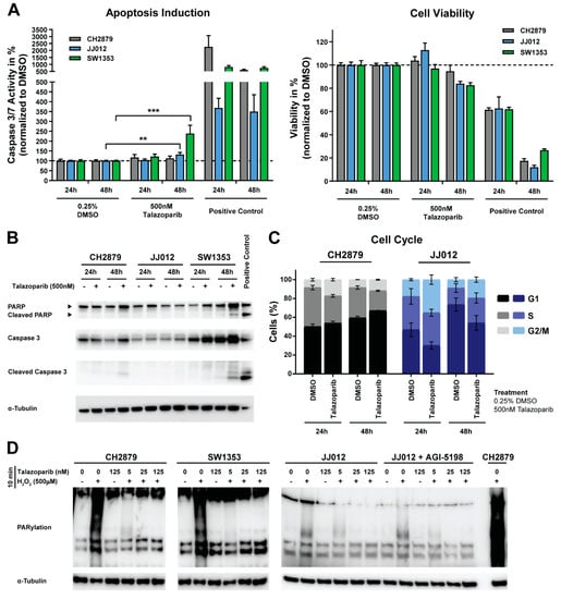 2.2. PARP Inhibition Minimally Induces Apoptosis and Causes a G2/M Phase Cell Cycle Arrest in Chondrosarcoma Cell Lines